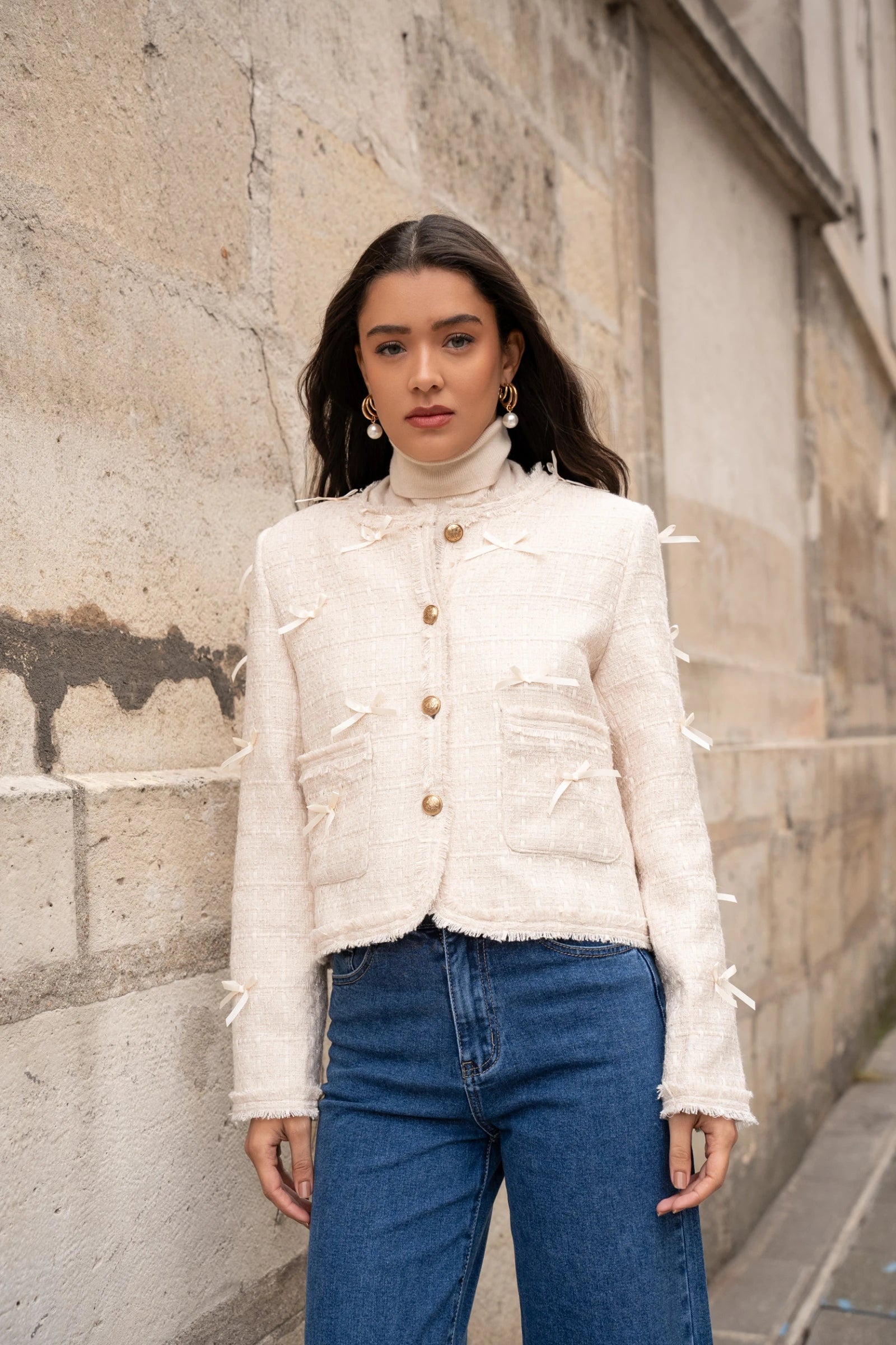 Coupe : Droite et structurée, légèrement raccourcie pour allonger la silhouette tout en assurant confort et élégance. Col : Col rond frangé, au fini brut, qui souligne l’esprit couture de la pièce tout en apportant une touche de modernité. Fermeture : Fermeture boutonnée ton sur ton à l’avant, discrète et raffinée, pour un porté à la fois pratique et soigné. Manches : Longues et droites, finies par des bords francs délicatement effilés, pour une note texturée subtile